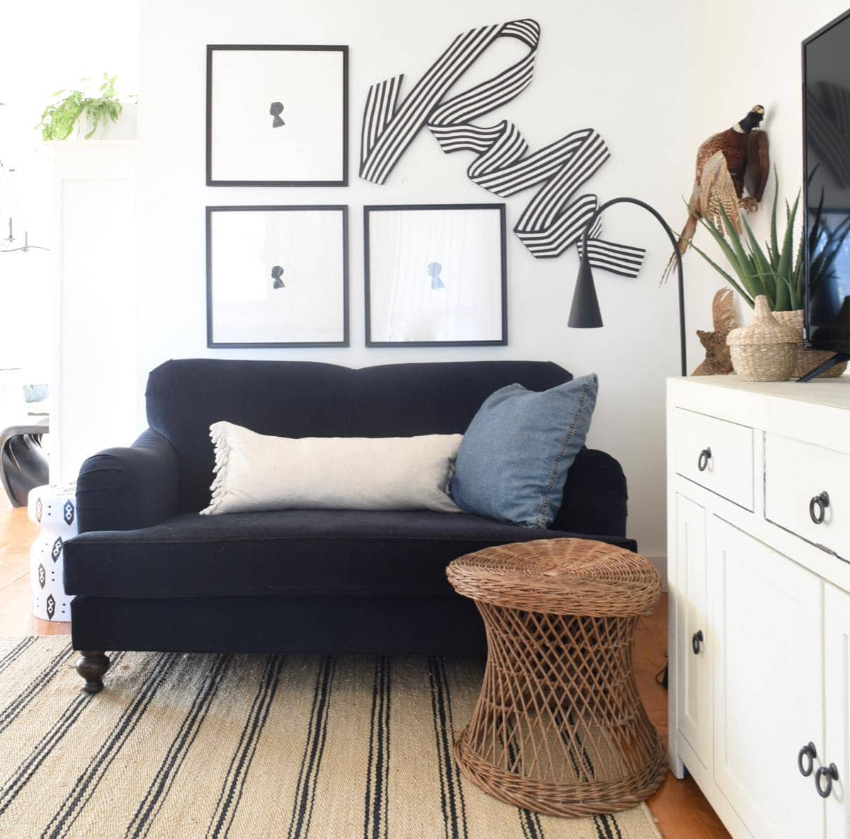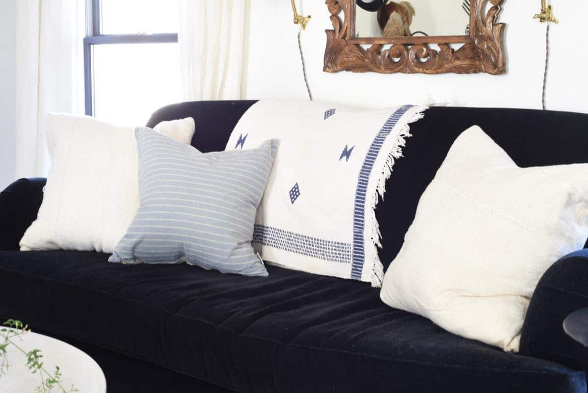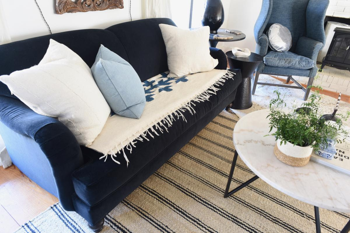I’ve had those big off white 24 inch corner/anchor pillows on the sofa through three seasons so far, and they continue to work so I played around with one of my throws and added a blue pillow for a little freshness.
