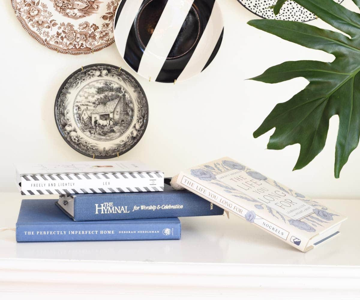 Another way I like to add low commitment seasonal color is simply by shopping my own bookshelves. I pulled out my favorite blue Hymnal and one of my all time favorite home books: The Perfectly Imperfect Home.