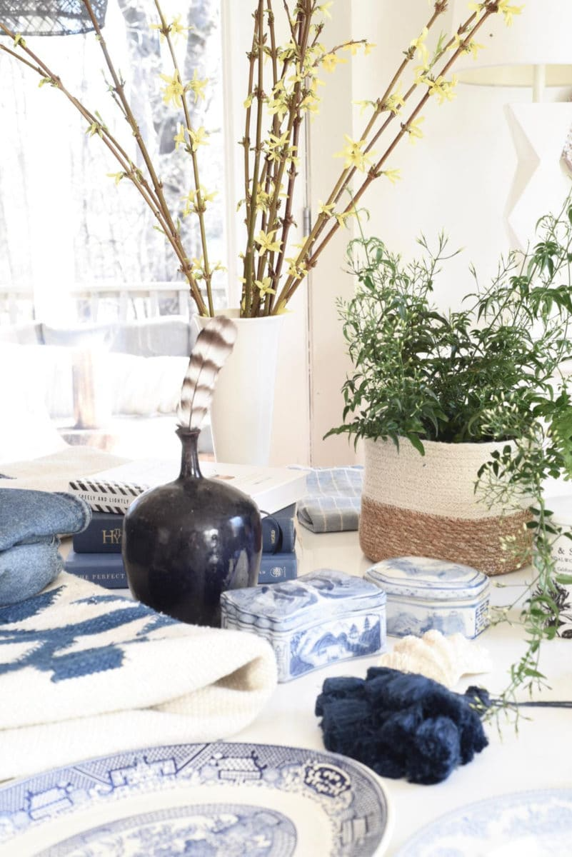 This is my favorite part. I just walk around looking in drawers, in my seasonal closet shelf, through my decorative dishes and pull out anything that currently feels a little spring-like.
